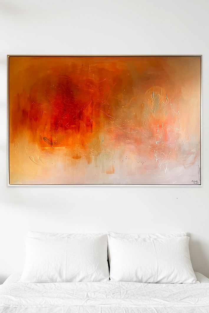 'Firefly' is a large-scale abstract piece with warm tones, designed to evoke a dreamlike, ethereal feeling. My intention was to create a work inviting the viewer into a deeply calm state, while gradually unveiling layers of depth and lovely detail over time.