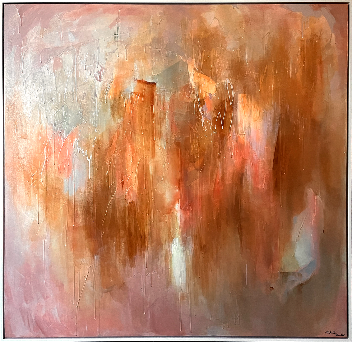 A dreamlike, fluid statement piece, this large-scale abstract artwork embodies freeform, expressive movement, catching the light as it dances across the canvas. The palette is soft yet grounded and blends warm earthy tones with muted pinks. Elegantly float-framed in white ash, it ís ready to hang and elevate any space.